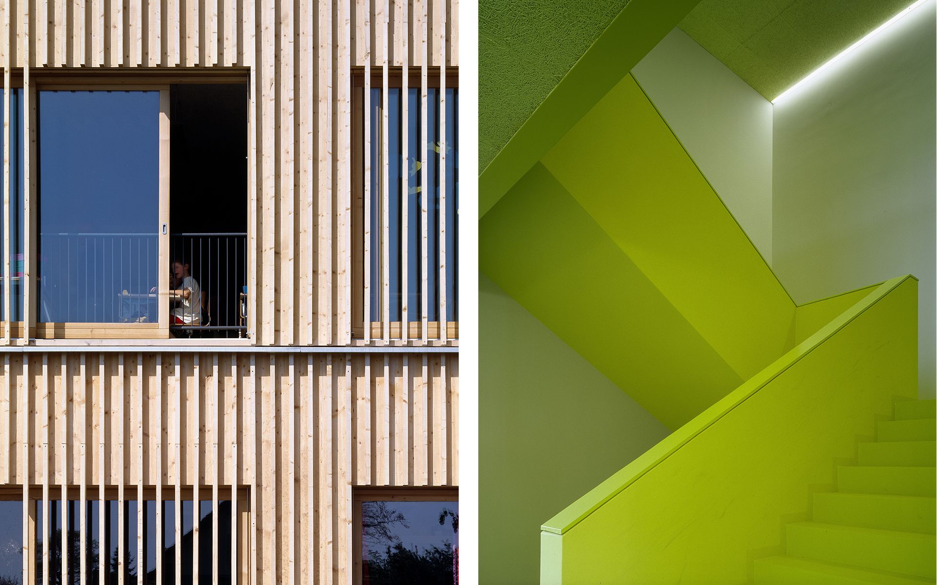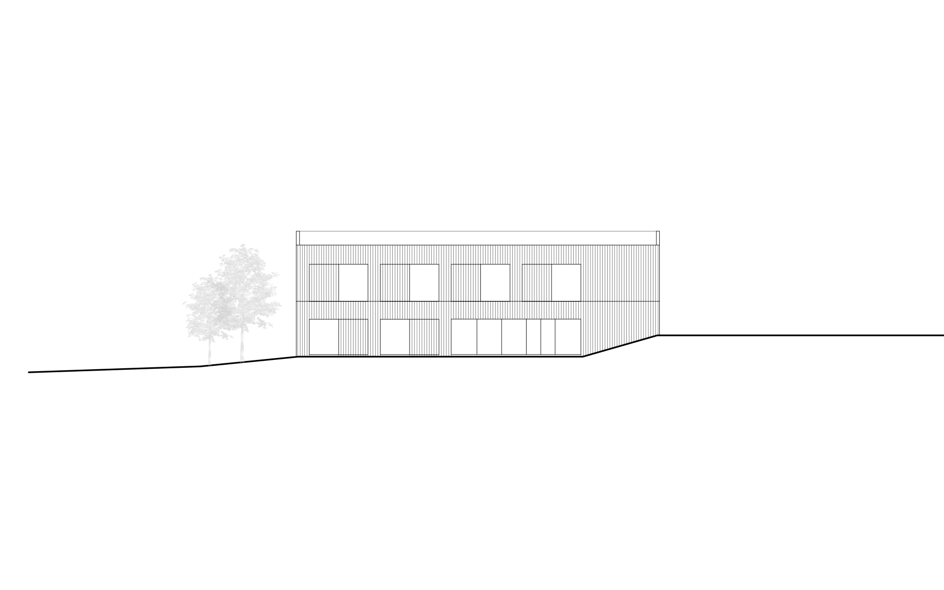La réalisation de cette école en bois se veut simple et modeste, à la manière des granges et des constructions agricoles environnantes. Les couvres-joints fixés entre les lames en bois du bardage de façade créent un jeu d’ombre et de lumière qui donne une texture particulière et une épaisseur à la façade, se transformant en claires-voie devant les baies vitrées des salles de classe.