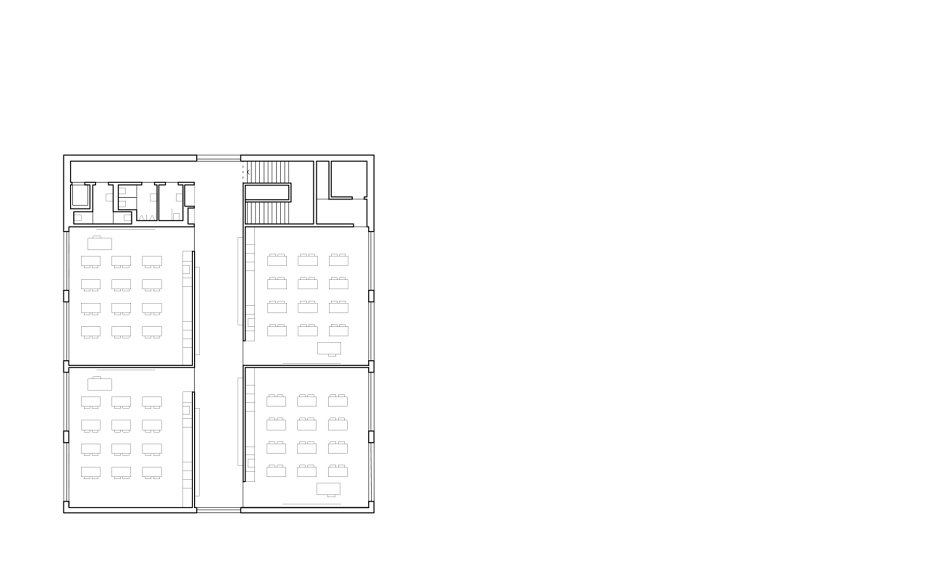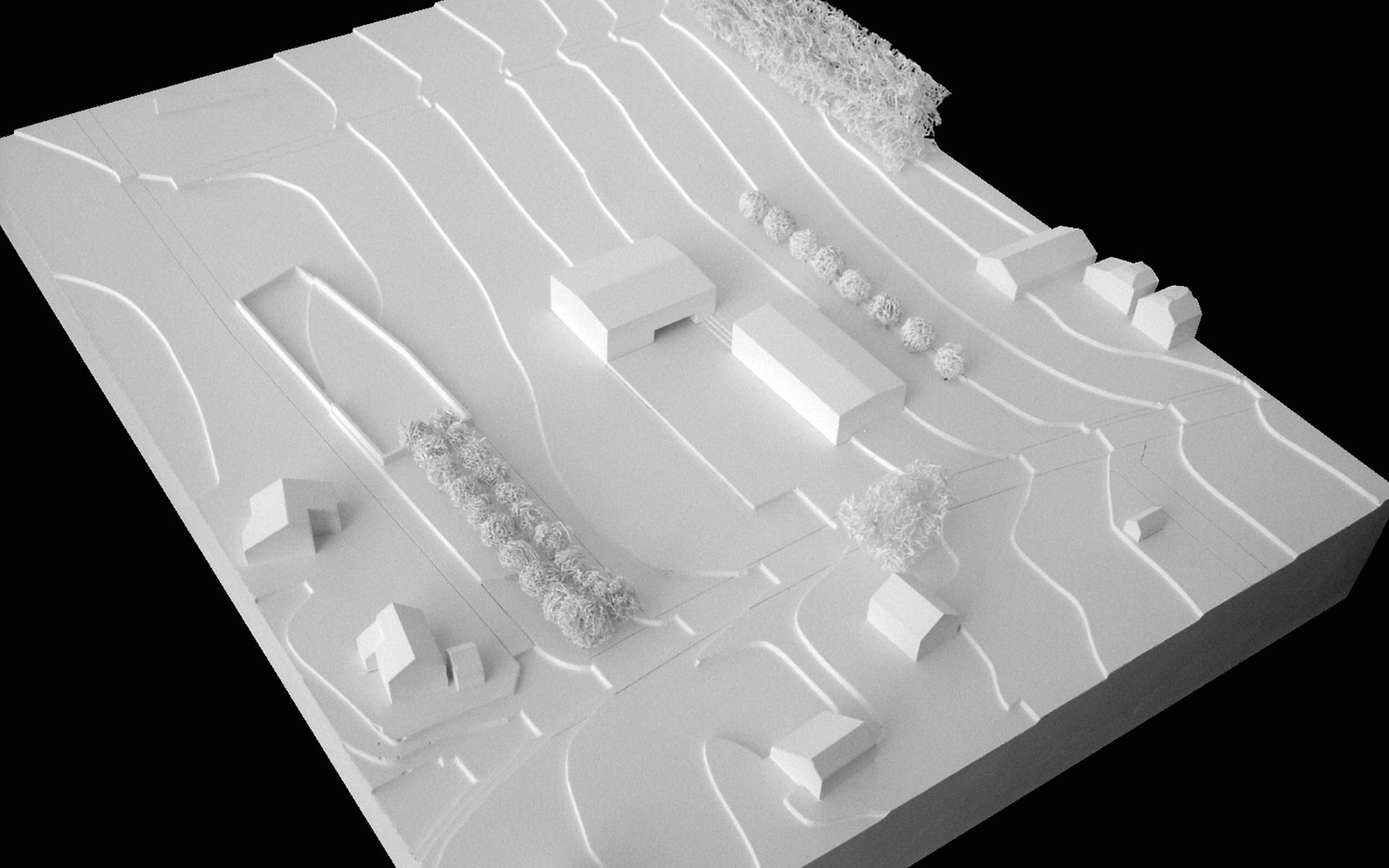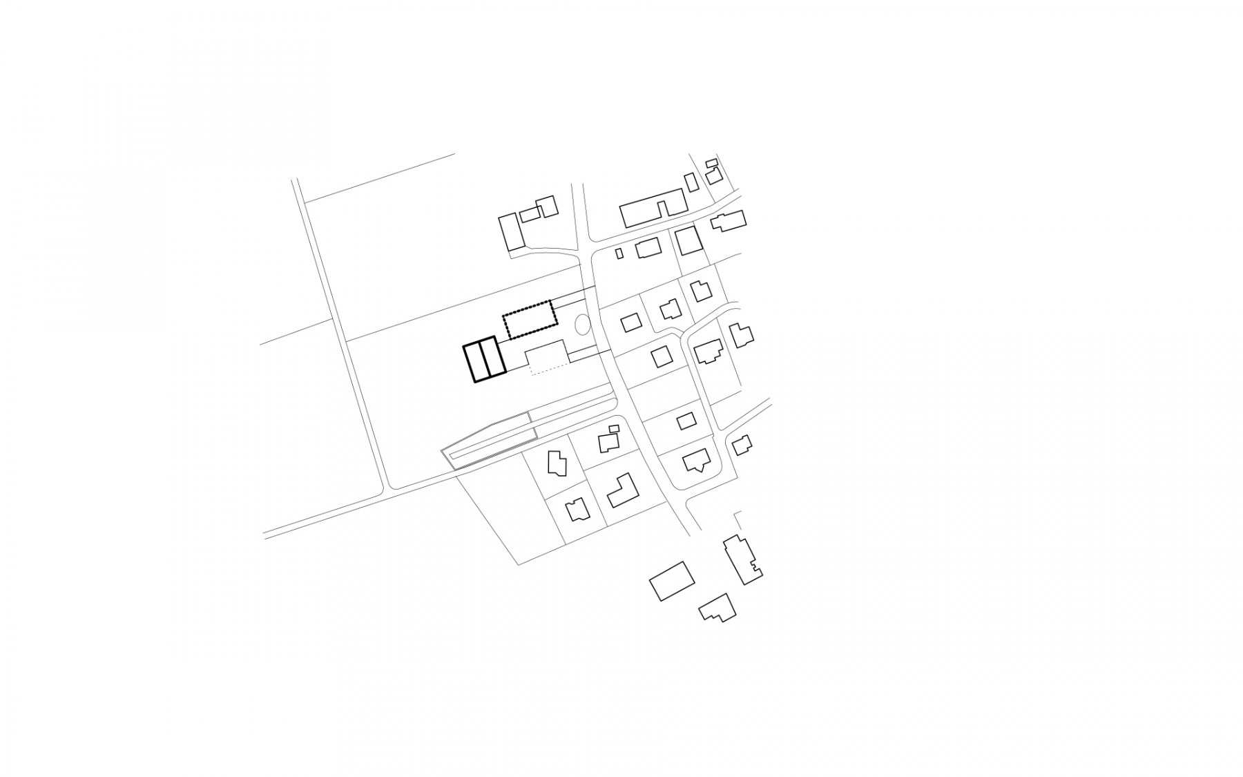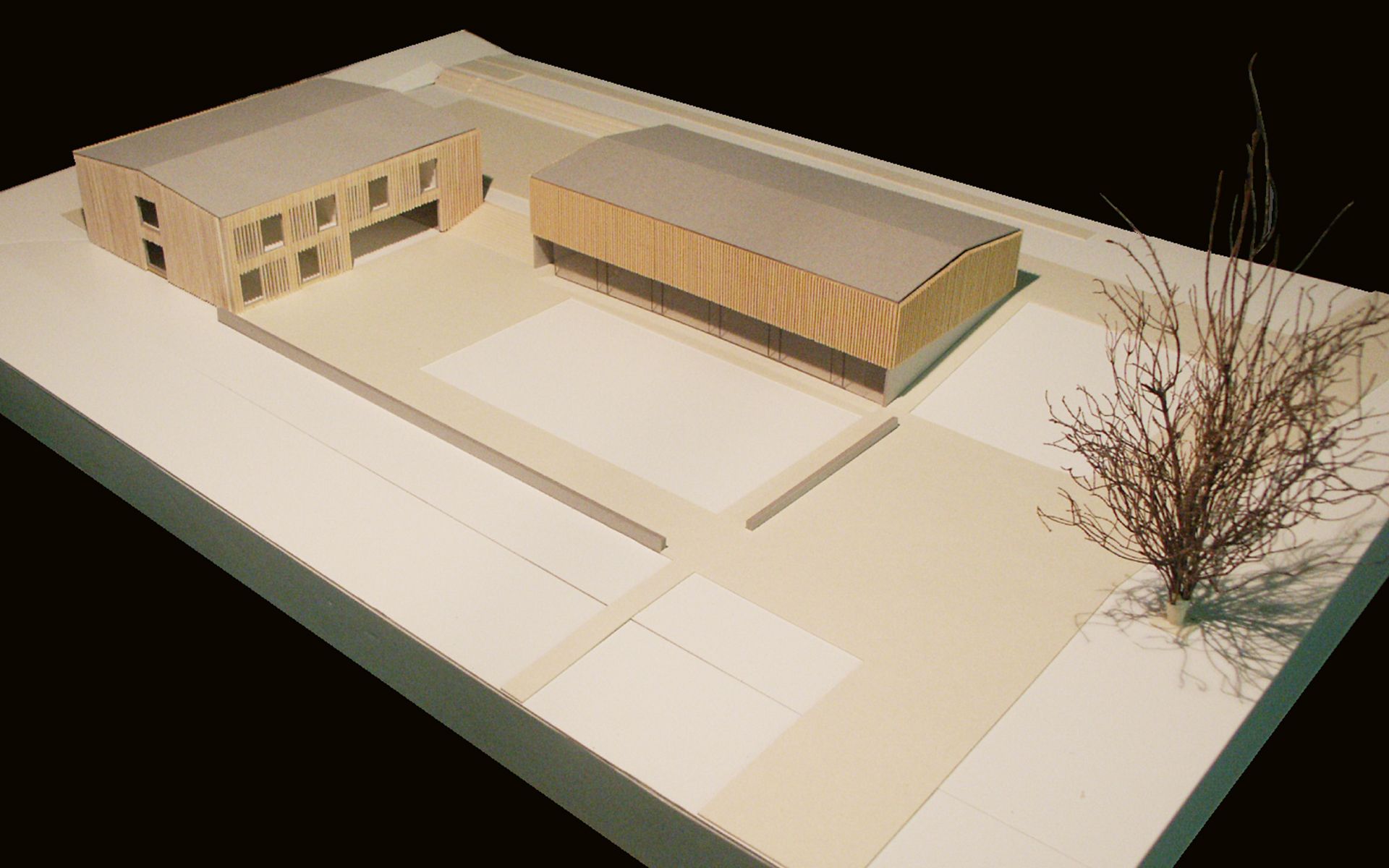 Le programme du concours d’architecture prévoyait la réalisation d’une salle de sport et d’une école de 6 salles de classe avec ses locaux annexes (bibliothèque, salle des maîtres, infirmerie). Seul le bâtiment de l’école à été réalisé à ce jour. Implanté dans la partie la plus plate du terrain, il délimite à l’ouest le préau de l’école, trait d’union avec la route traversant le village.  La salle de sport adossée à la pente du terrain délimitait et accompagnait le préau au nord, en profitant de la déclivité du terrain pour enterrer une partie de son programme et réduire sa volumétrie dans le site.