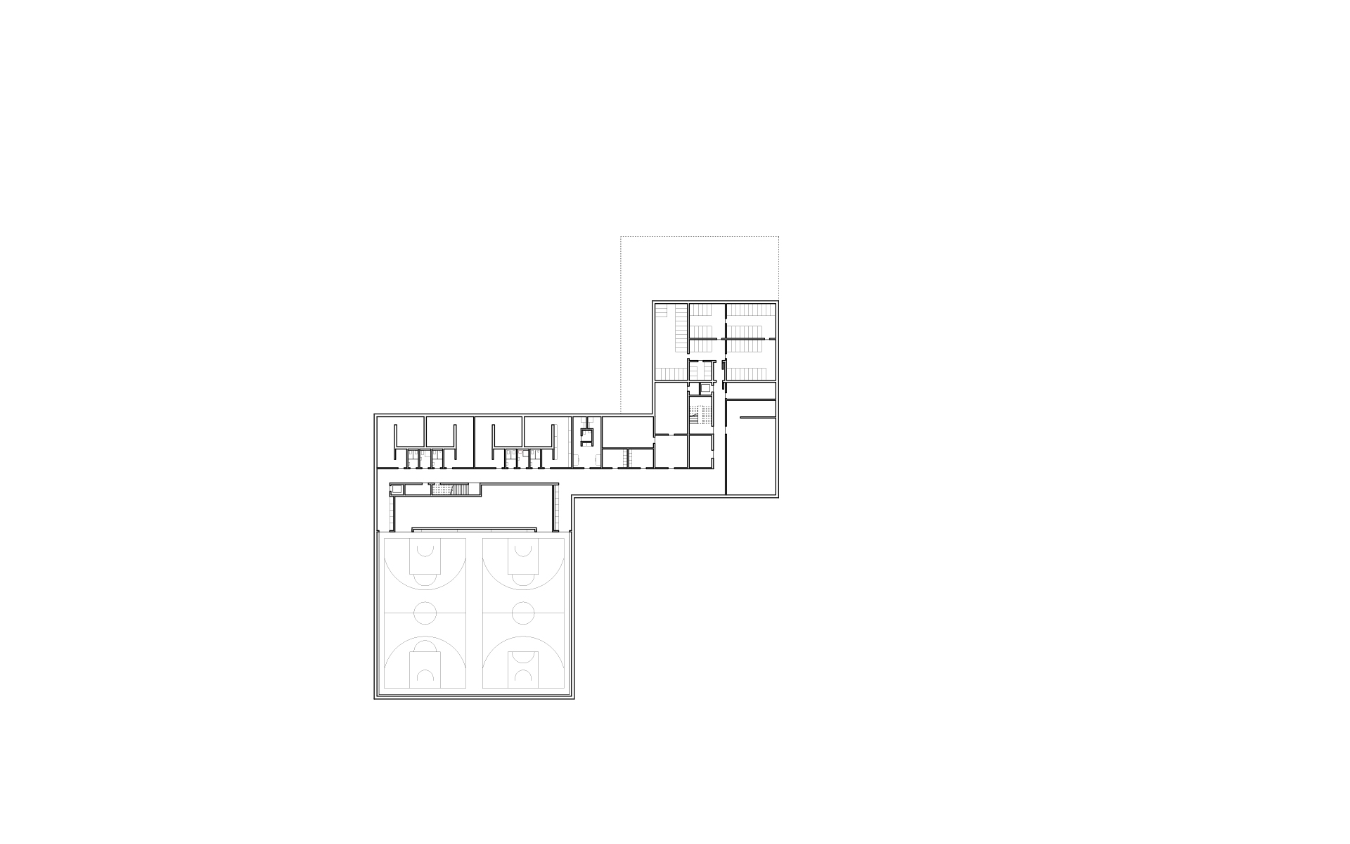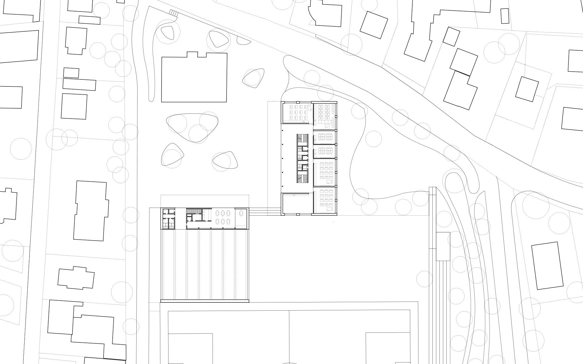 Le projet veut reconnaître l’importance de ce « chemin des écoliers » en articulant le long de ce dernier le préau de l’école, autour duquel se déploient les autres bâtiments scolaires : l’école existante, la nouvelle école et les salles de sport en relation directe avec la zone sportive existante. Ce nouvel ensemble unitaire permet de réaliser sur le reste de la parcelle un terrain de football et un parc sportif pour les habitants du quartier.