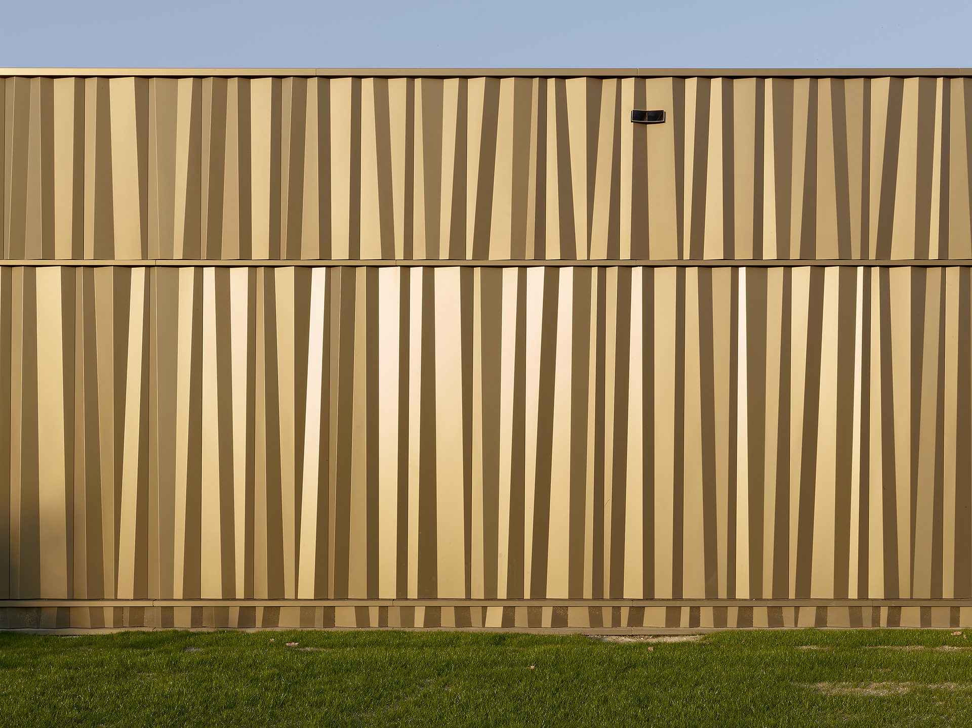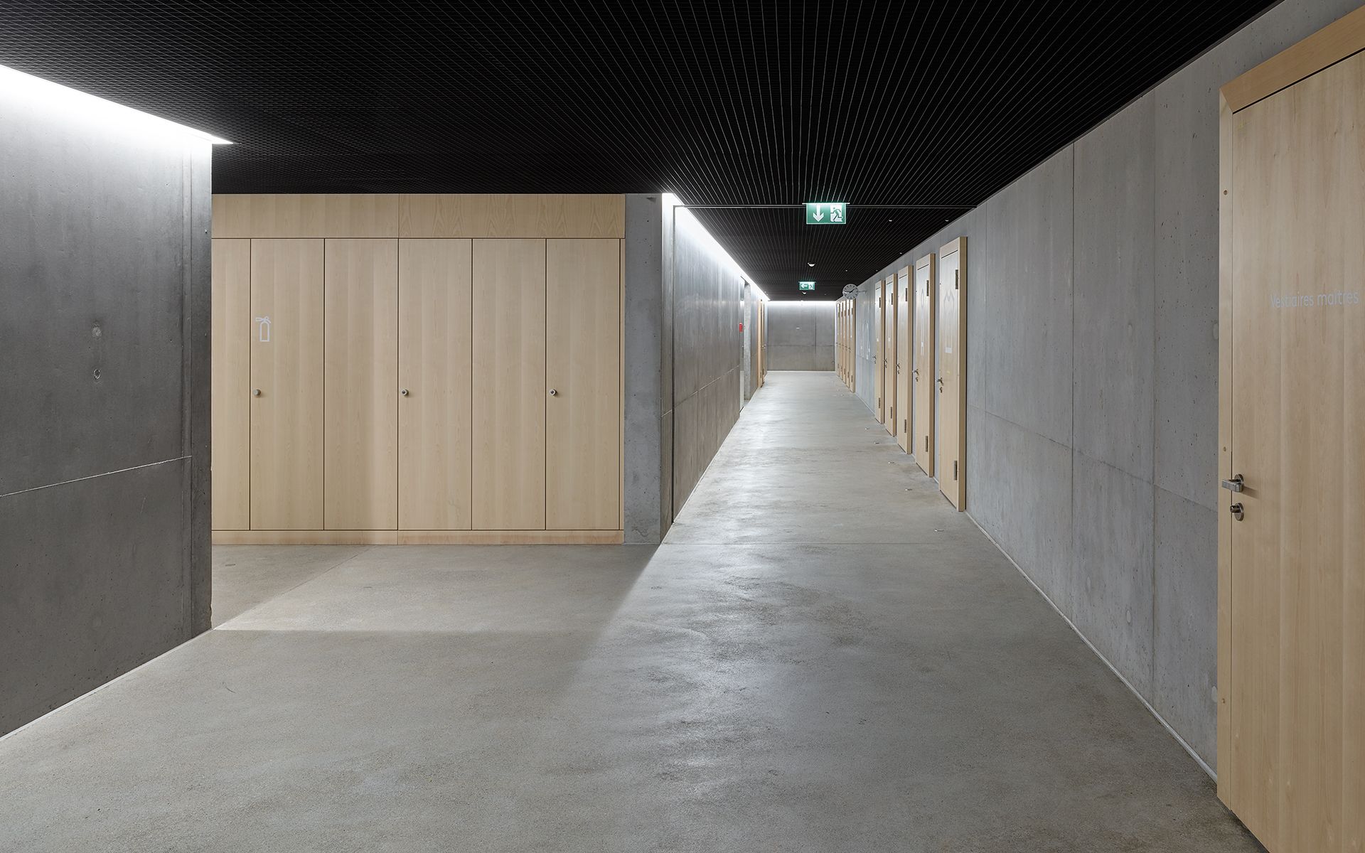 Les salles de classes sont disposées de part et d’autre d’un bloc de services qui ménage à chaque extrémité un vaste espace de dégagement ouvert en façade et pouvant accueillir des activités polyvalentes. Les salles de sport semi- enterrées sont reliées en sous-sol au bâtiment de l’école.