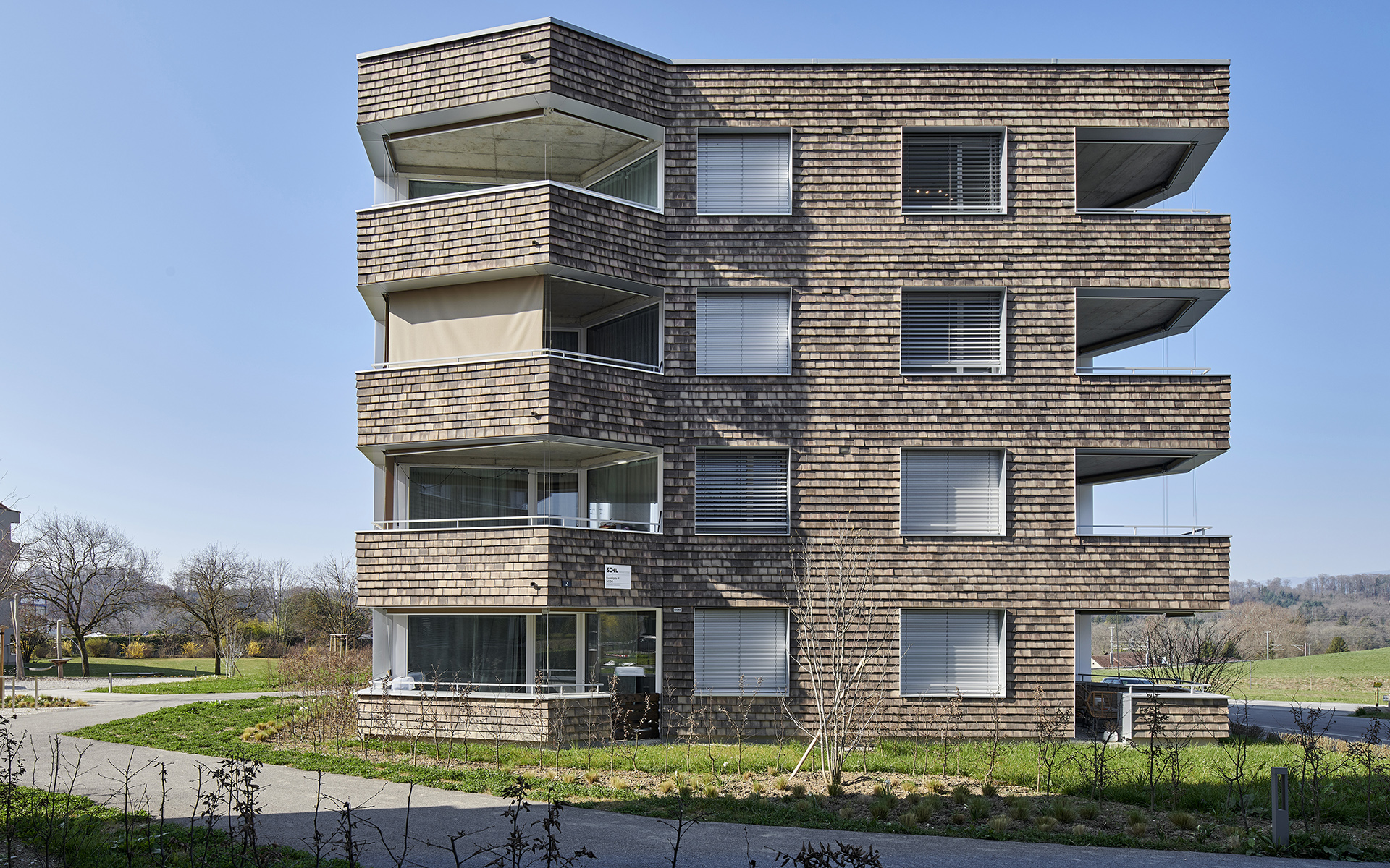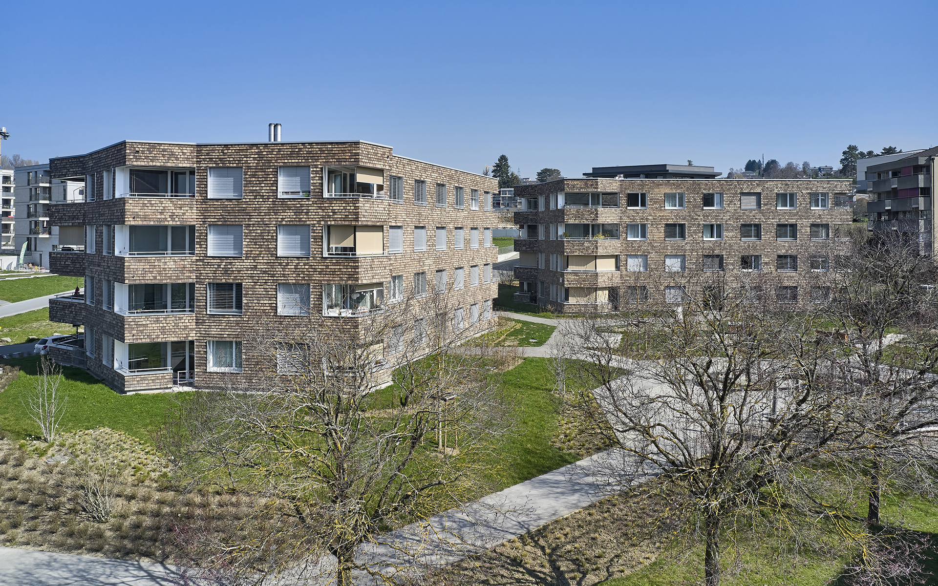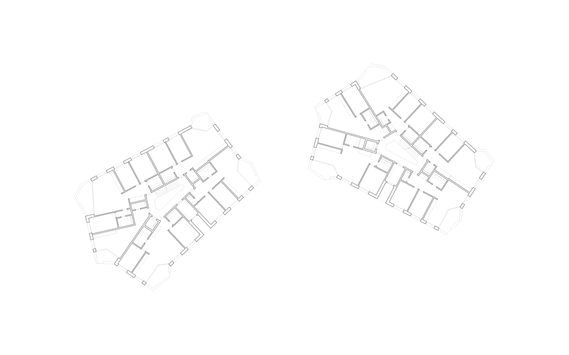 Les deux immeubles sont compacts et de formes polygonales, permettant de proposer une grande variété d’appartements en angle, tous avec une double orientation. Les différents types d’appartements se répartissent autour d’une cage d’escalier commune éclairée en son centre par un puit de lumière naturelle. Cet espace de distribution fonctionne comme lieu de rencontre et d’échange entre habitants. On y accède par les entrées des immeubles qui se situent à l’intérieur de la cour-jardin et qui sont disposées de manière à assurer la fluidité des aménagements extérieurs et de leurs équipements. L’organisation des appartements est simple et rationnelle. Du hall d’entrée qui distribue les chambres et les locaux sanitaires, on perçoit d’un seul coup d’œil l’appartement dans toute sa spatialité et sa profondeur. Le coin repas et le séjour de dimensions généreuses se prolongent à l’extérieur dans une vaste loggia, véritable pièce à vivre ouverte sur des aménagements paysagers de qualité.