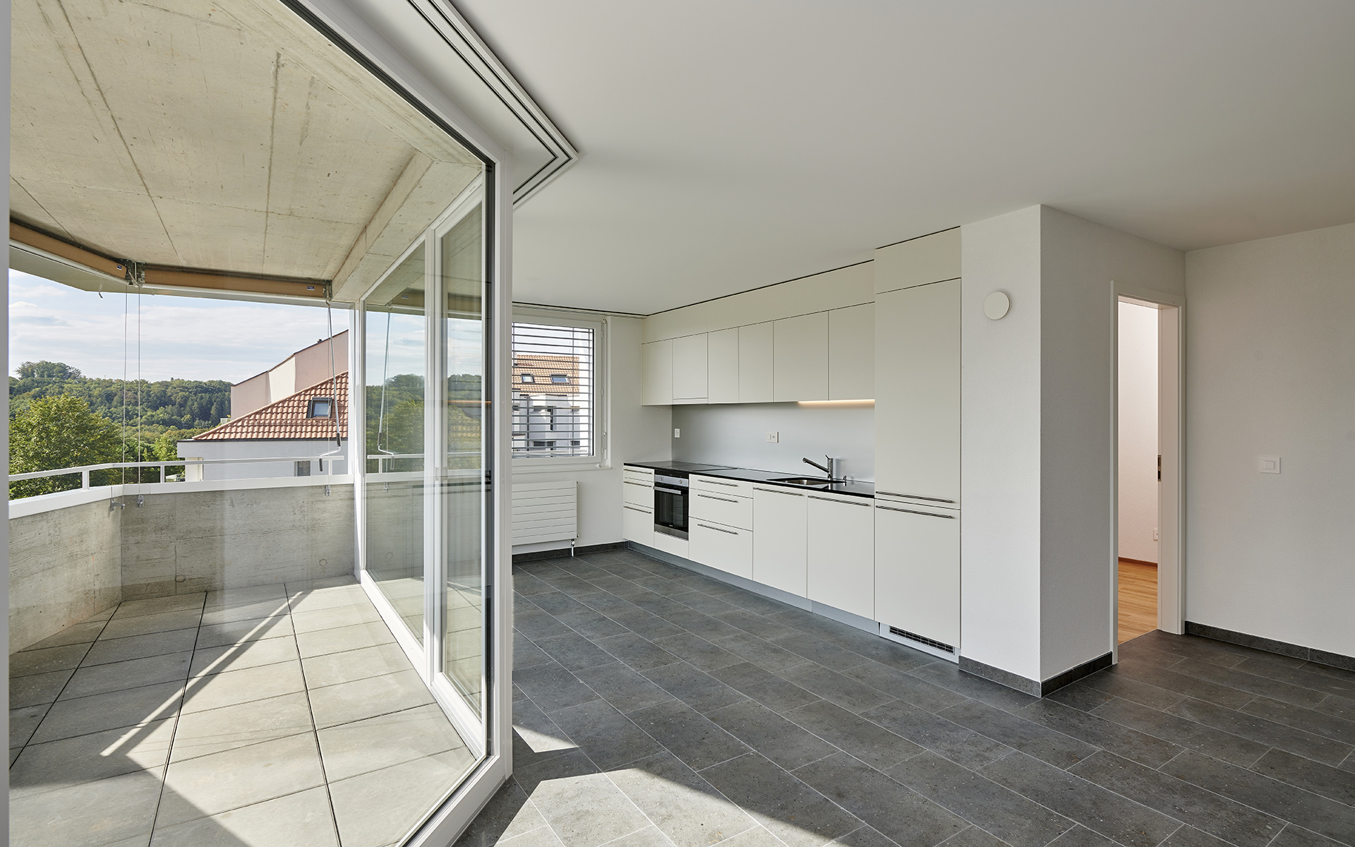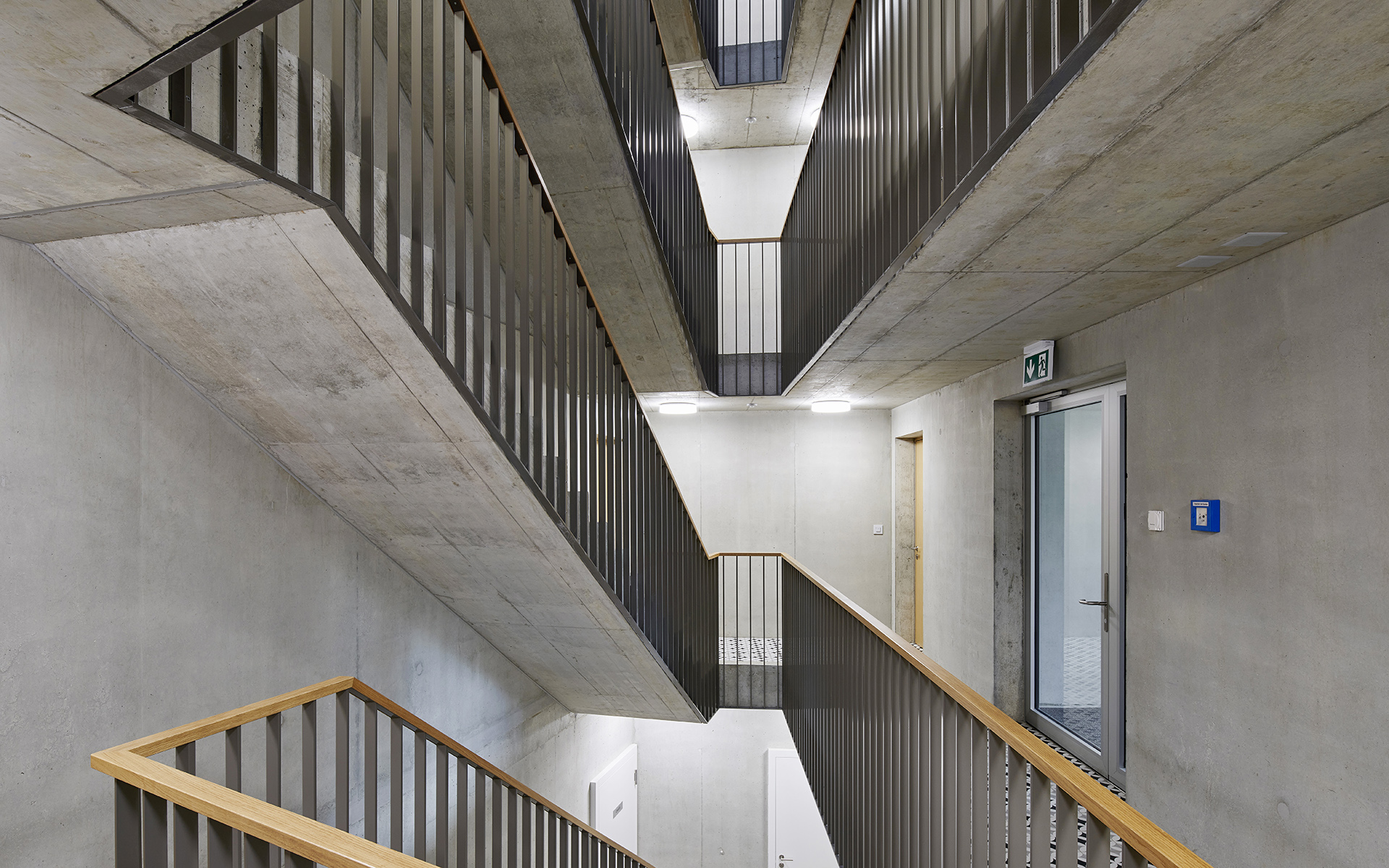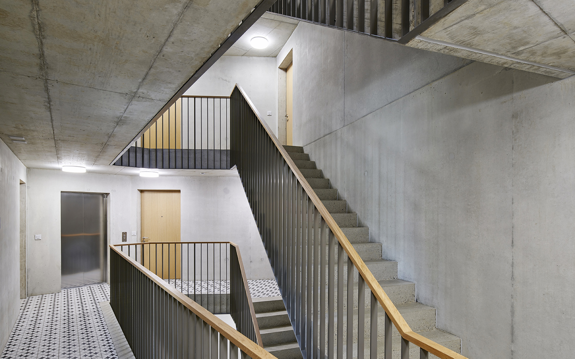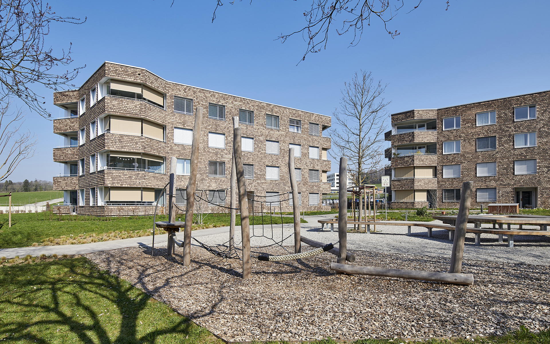 Les deux immeubles sont compacts et de formes polygonales, permettant de proposer une grande variété d’appartements en angle, tous avec une double orientation. Les différents types d’appartements se répartissent autour d’une cage d’escalier commune éclairée en son centre par un puit de lumière naturelle. Cet espace de distribution fonctionne comme lieu de rencontre et d’échange entre habitants. On y accède par les entrées des immeubles qui se situent à l’intérieur de la cour-jardin et qui sont disposées de manière à assurer la fluidité des aménagements extérieurs et de leurs équipements. L’organisation des appartements est simple et rationnelle. Du hall d’entrée qui distribue les chambres et les locaux sanitaires, on perçoit d’un seul coup d’œil l’appartement dans toute sa spatialité et sa profondeur. Le coin repas et le séjour de dimensions généreuses se prolongent à l’extérieur dans une vaste loggia, véritable pièce à vivre ouverte sur des aménagements paysagers de qualité.
