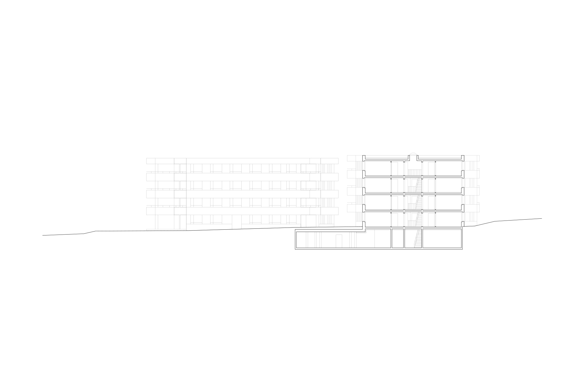 L’implantation des bâtiments cherche à mettre en valeur les qualités du site. Deux volumes disposés en forme d’équerre se mettent en relation avec le contexte environnant tout en dégageant un vaste espace de jardin au centre. Les deux volumes forment un front bâti qui sépare ce grand jardin de l’espace publique de la rue. Le vaste jardin libéré au sud s’inscrit dans le prolongement des espaces paysagers des deux bâtiments existants de la Coopérative, la SCHL. Un parking souterrain est aménagé sous le jardin et relie en sous-sol les deux immeubles, permettant de consacrer entièrement le quartier au piétons.