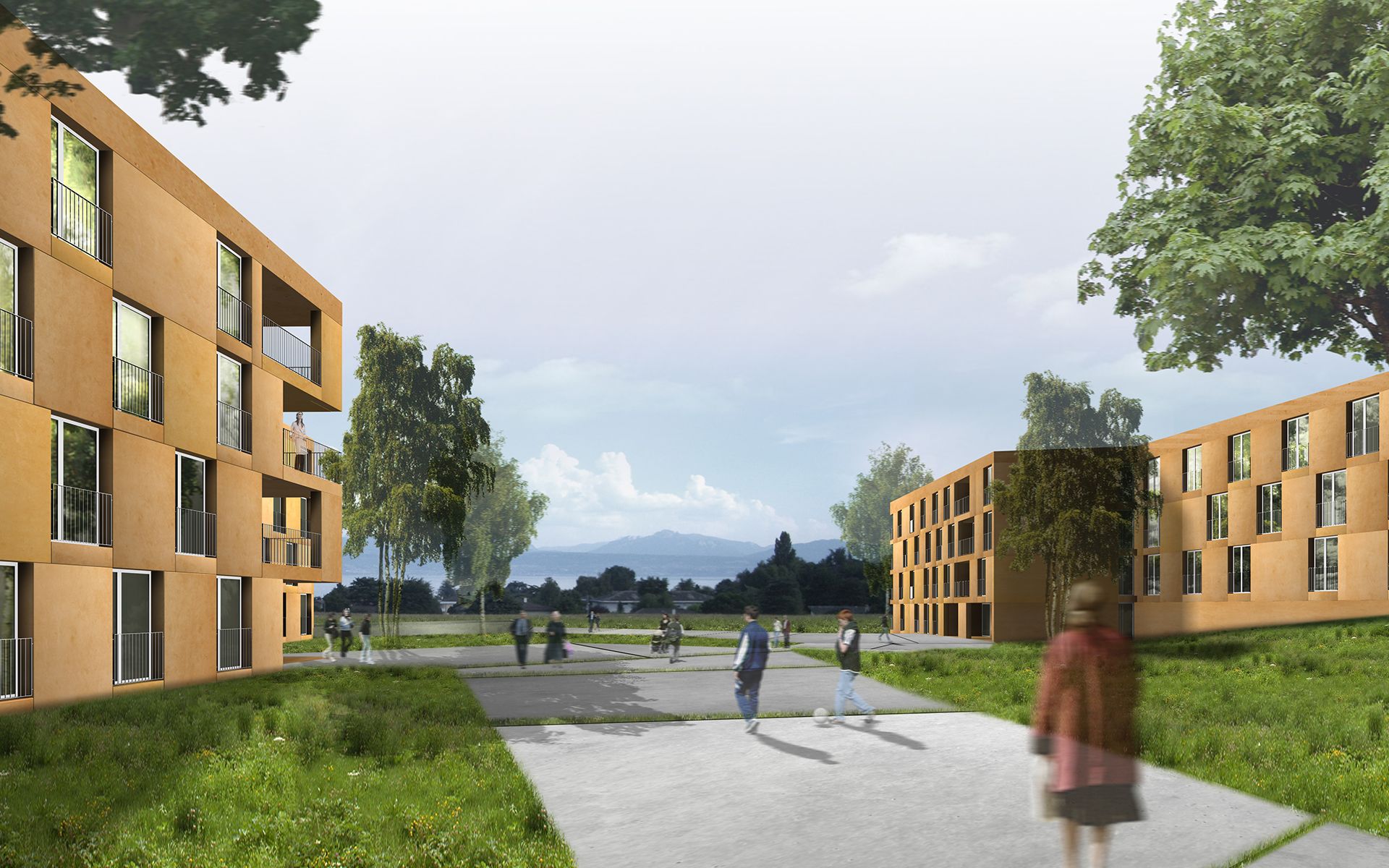 Le projet s’insère dans un tissu de villas et de petits immeubles de logements en-dessous de la route cantonale, sur un terrain s’étalant en pente douce en direction du lac Léman. Le programme se répartit dans quatre volumes en forme de baïonnette qui laissent «couler» entre eux de larges surfaces végétalisées, ouvertes sur le lac. Le choix de cette figure et l’implantation proposée permettent d’éclairer naturellement tous les espaces de circulation et de rencontre, qui s’ouvrent vers le sud, en distribuant toutes les chambres à l’est et à l’ouest. Le décalage des volumes permet de lire les différentes unités de chambres regroupées autour d’une cage d’escalier commune.