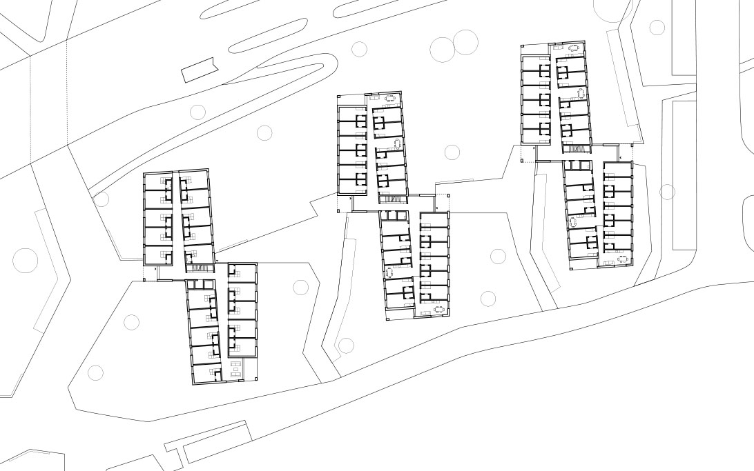 La figure en forme de baïonnette reprend et souligne les deux géométries présentes sur le site, d’un côté celle des bâtiments EPFL, de l’autre l’orientation naturelle de la pente et des ses courbes de niveaux. Le choix de limiter la hauteur des bâtiments à 4 niveaux (rez +3) donne une échelle modeste aux bâtiments, en leur permettant une meilleure intégration dans le contexte environnant.