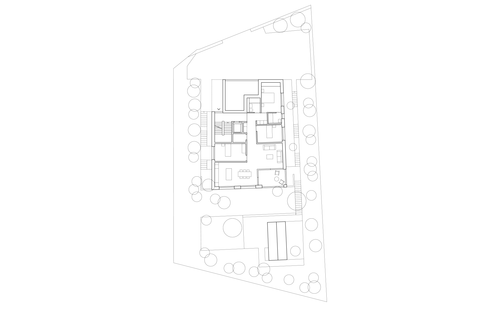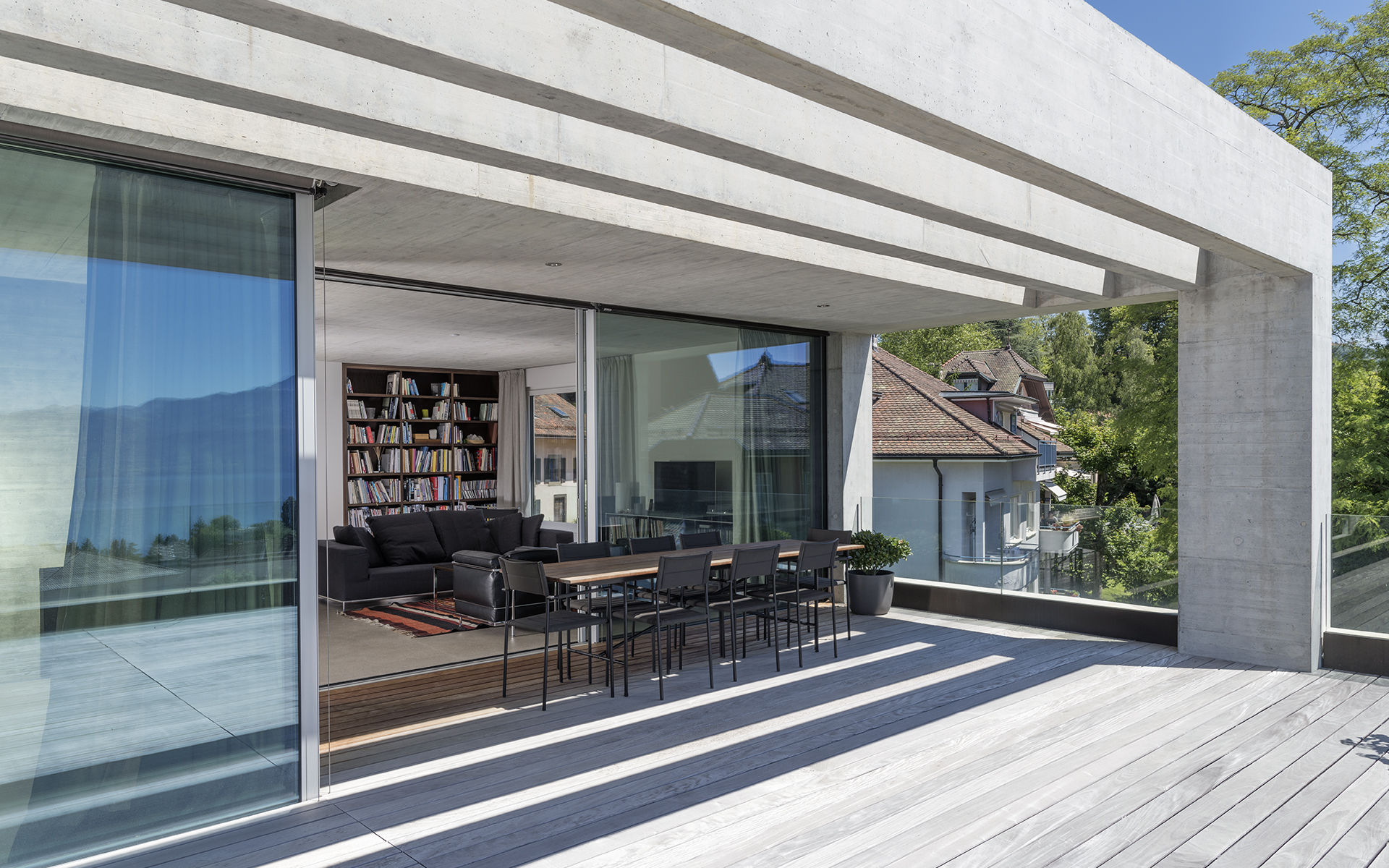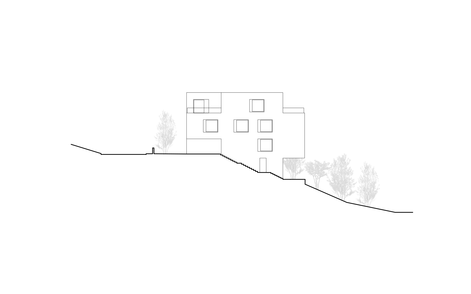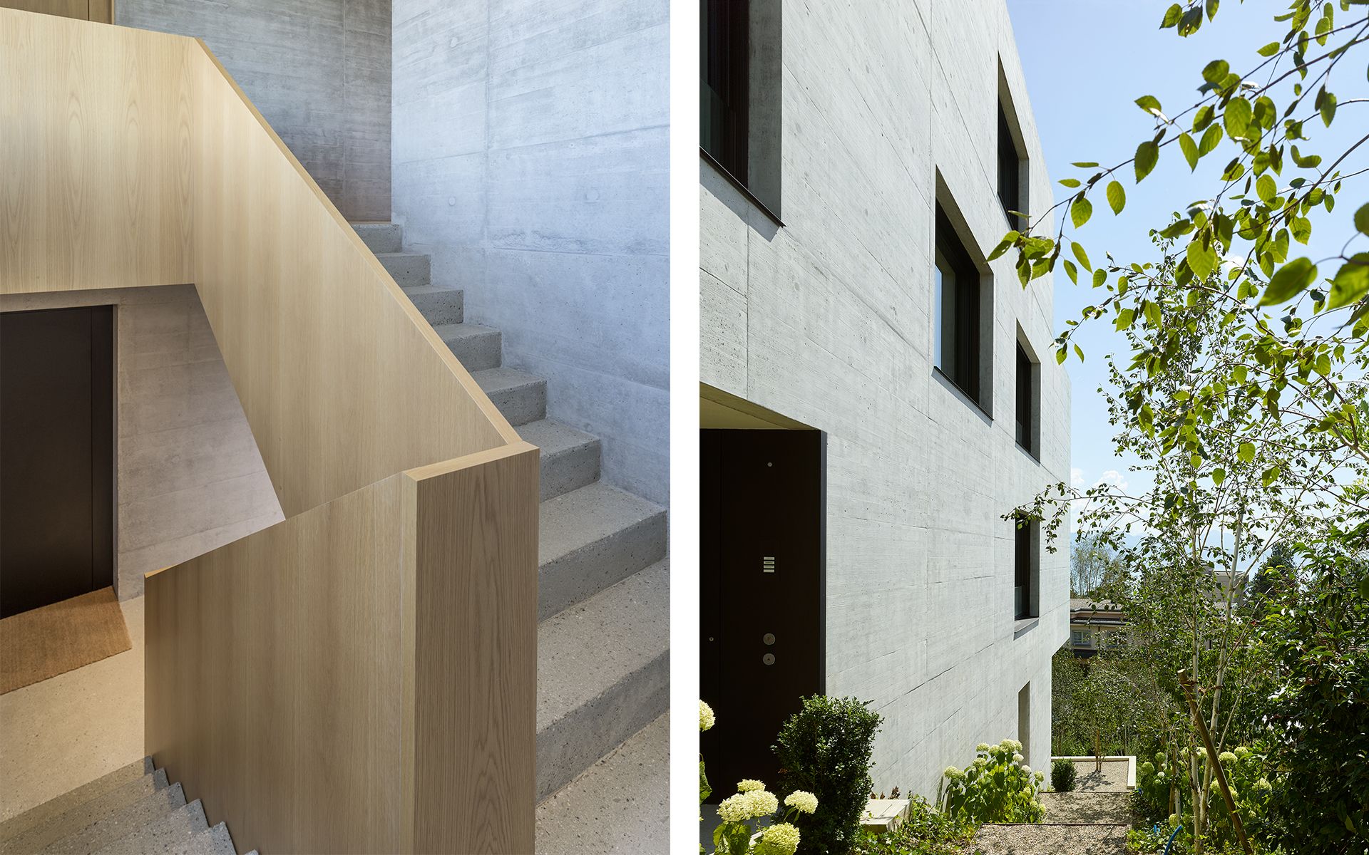 Inséré dans un tissu urbain hétéroclite, le nouveau bâtiment en béton brut apparent se présente comme un monolithe minéral surgissant de la végétation, dans lequel sont creusées des terrasses, des loggias et des couverts. La parcelle en forte déclivité s’ouvre en direction du sud et offre de beaux dégagements vers le lac et les montagnes. Une cage d’escalier éclairée en façade distribue trois appartements de surfaces similaires: 2 appartements sur un niveau et 1 appartement d’attique en duplex. Les appartements s’organisent de manière fluide en réduisant les espaces de circulation au profit des espaces de vie. La cuisine et le séjour s’articulent autour d’une grande loggia ou d’une terrasse ouverte au sud et à la vue. Chaque appartement bénéficie de trois ou quatre orientations. Les murs extérieurs en béton sont porteurs. Les fenêtres sont conçues comme de grandes ouvertures sur le paysage et le contexte bâti environnant. Elles se décomposent en deux parties: un volet plein pour la ventilation et une partie vitrée pour la vue et la lumière. Le jardin paysagé est constitué de terrasses qui s’étagent dans la pente, parfois minérales, parfois végétales, créant des ambiances spécifiques qui en agrémentent l’usage.