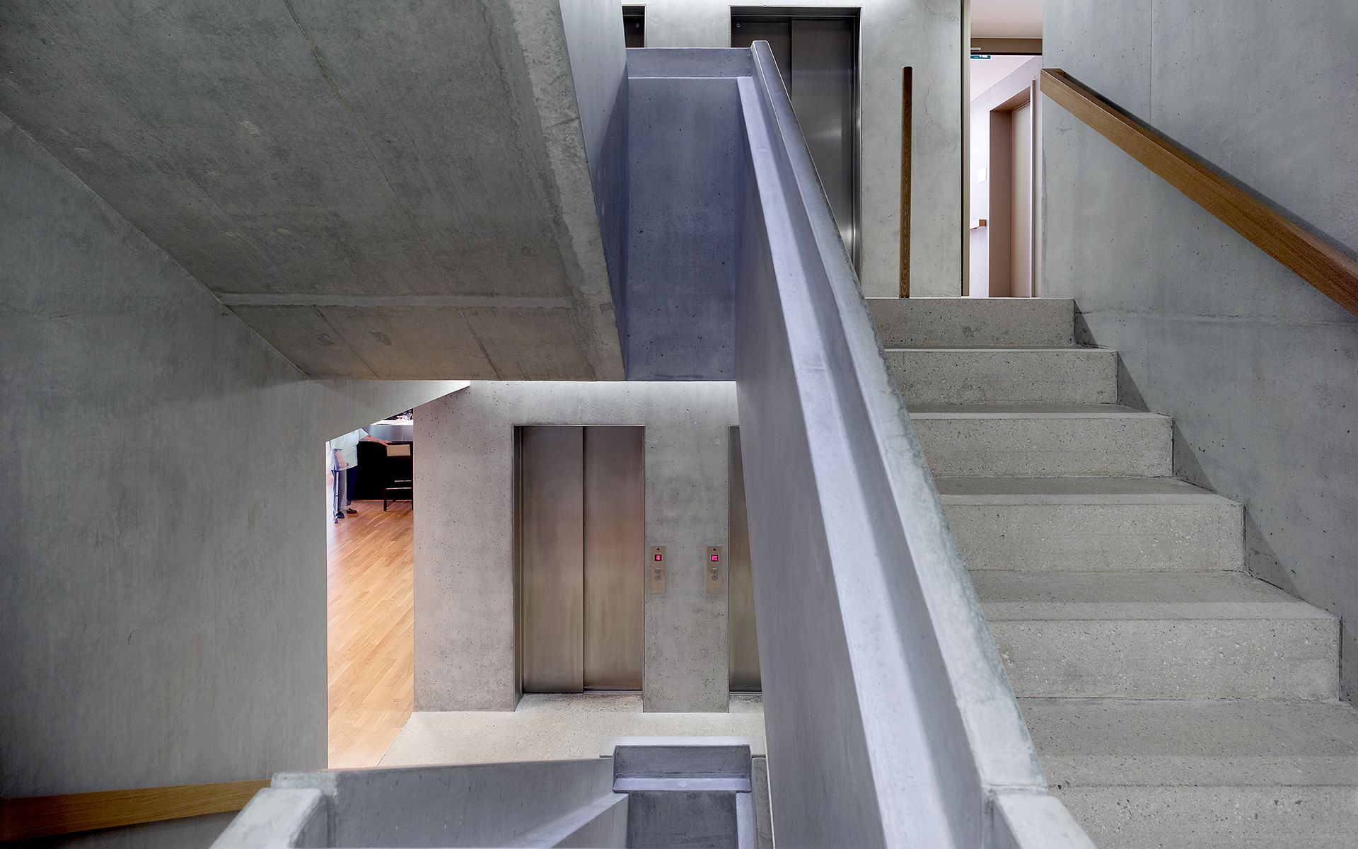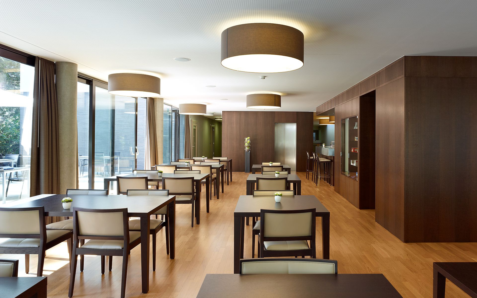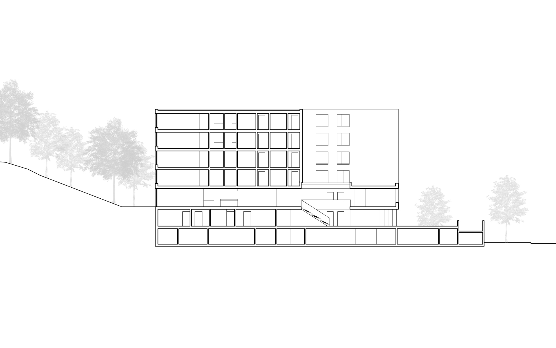 Le bâtiment s’articule en deux volumes décalés en plan, lui conférant une échelle en rapport avec les bâtiments voisins, tout en permettant à ceux-ci de conserver un bon dégagement sur le paysage environnant. Un socle pris dans la pente contient toutes les activités communes de l’EMS, bureaux, salles communes, cuisine, restaurant. Dans le prolongement du restaurant, une terrasse s’ouvre vers le sud, en relation avec le jardin. L`arborisation caractérisant cet ancien parc est conservée.