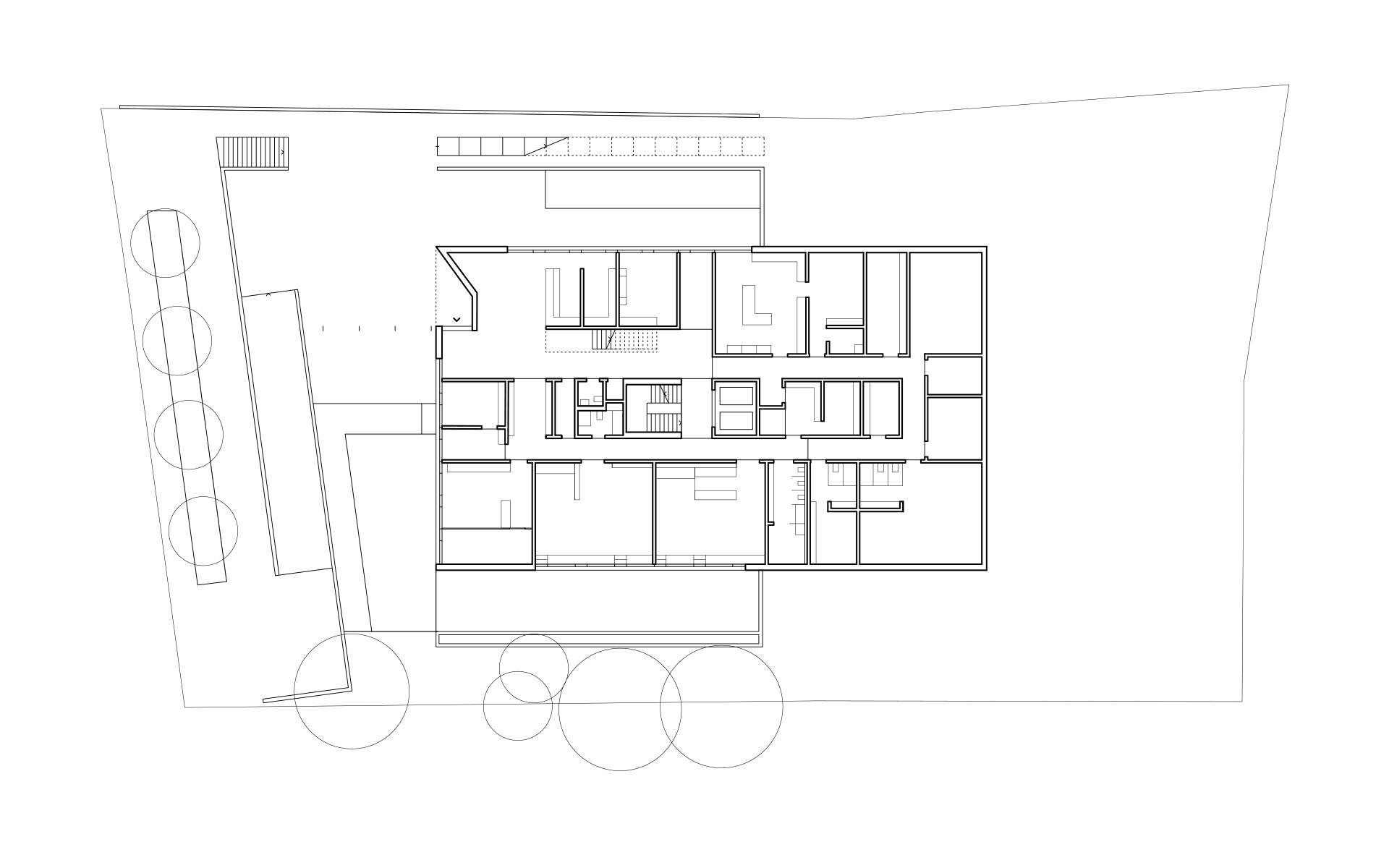 La parcelle étroite et allongée devant accueillir le nouvel EMS est dominée dans sa partie haute par la villa Diserens, une belle demeure bourgeoise du début du siècle. Le projet concentre tout le programme dans la partie basse de la parcelle, permettant la création d’un jardin protégé entre les deux constructions, en laissant la villa autonome et libre d’affectation.
