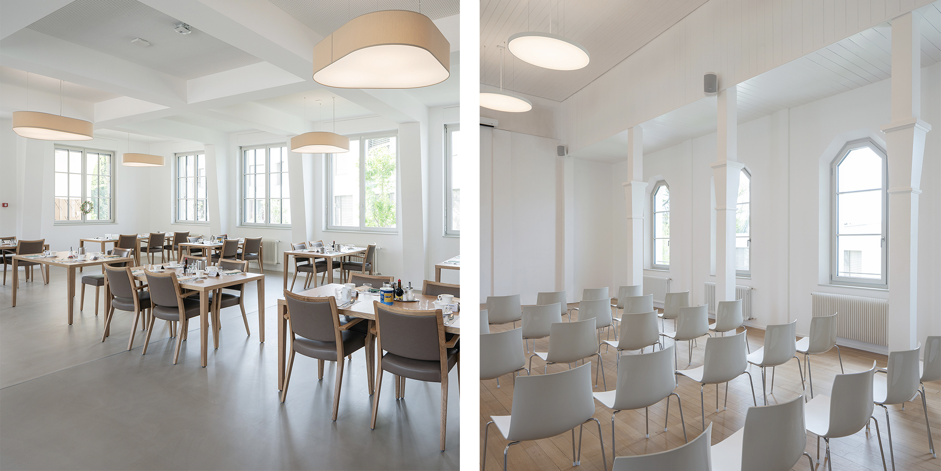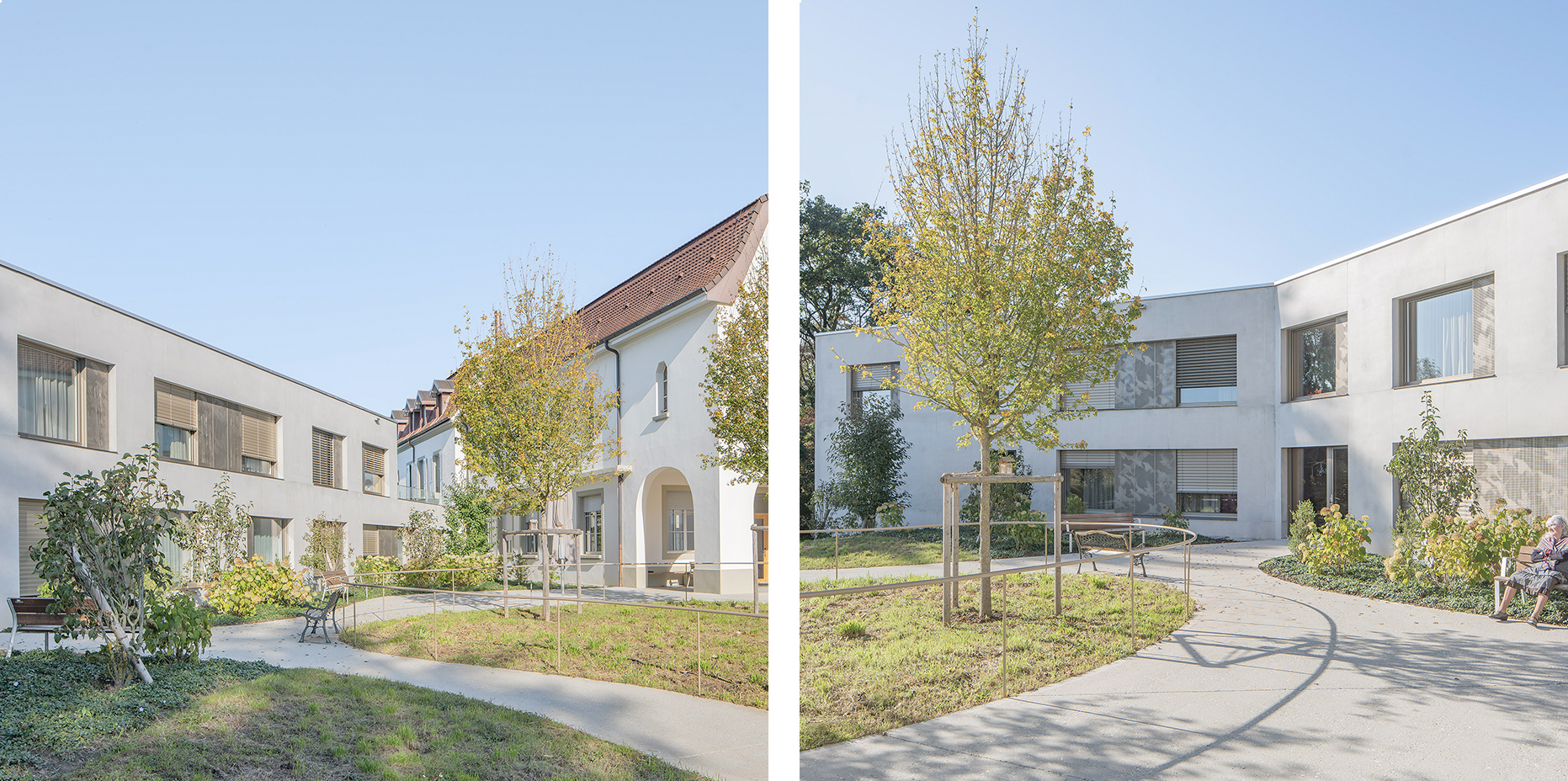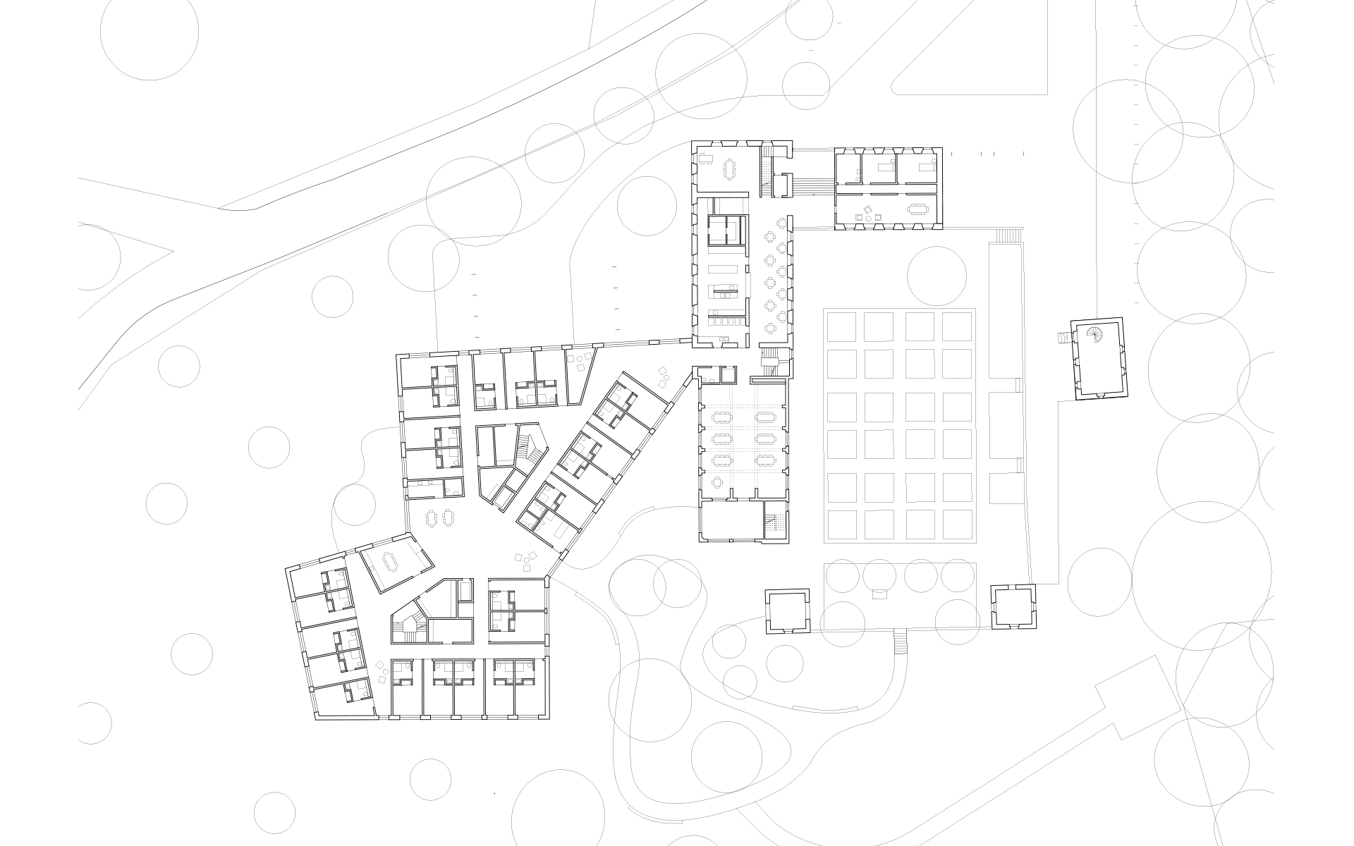 Les façades à pans brisés permettent d’ouvrir toutes les chambres à la vue, en évitant les vis-à-vis gênants avec les constructions existantes proches. La mémoire du jardin à la française et son ancien belvédère sont rétablis et mis en relation avec un nouveau jardin paysager, dont les courbes des chemins et des places se déploient de manière naturelle dans la pente du terrain pour favoriser la détente ou la promenade des résidents.